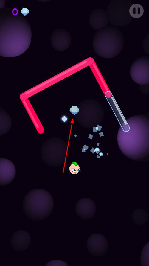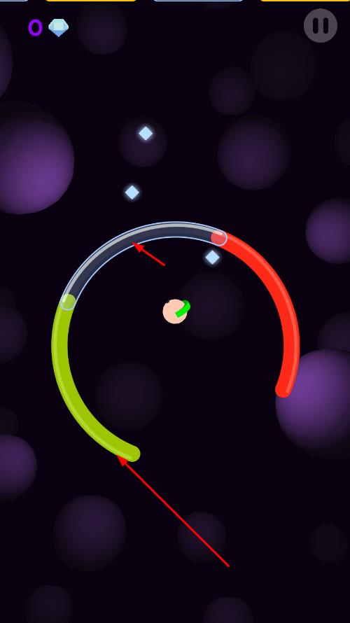 2、小球会遇到各种颜色的障碍条,通过点击屏幕让小球跳跃,避开障碍条,或者借助障碍条的反弹继续前进,收集画面中的钻石来获取分数。