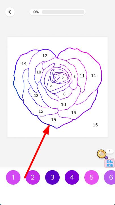 2、放大图片找到带有数字的区域,点击颜色面板中对应的颜色,再点击该数字区域进行上色,按顺序逐步填充画面的每一个部分。