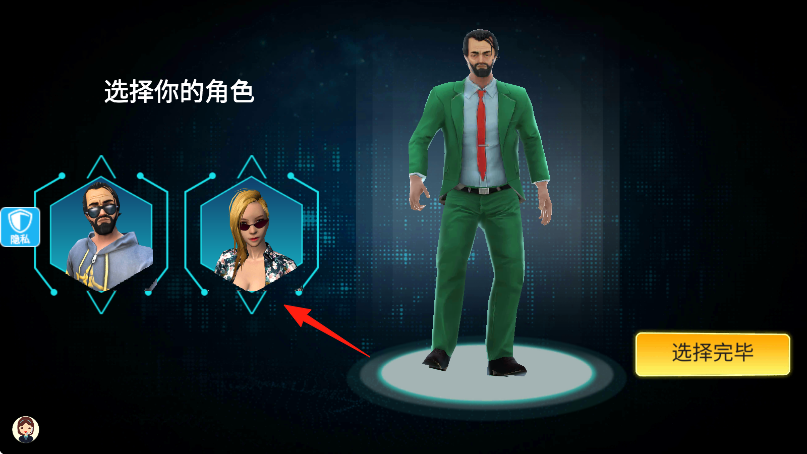 1、点击箭头指向的女性角色墨镜、花纹上衣,再按选择完毕,进入游戏。