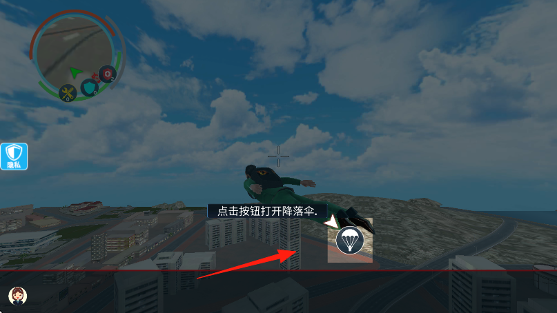 2、高空下落时,点打开降落伞按钮,控制落点,降落到城市区域,开启任务。