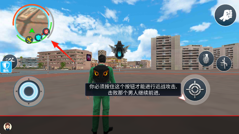 3、落地后,按箭头提示,长按近战攻击按钮小地图旁,击败敌人,推进主线,熟悉操作。