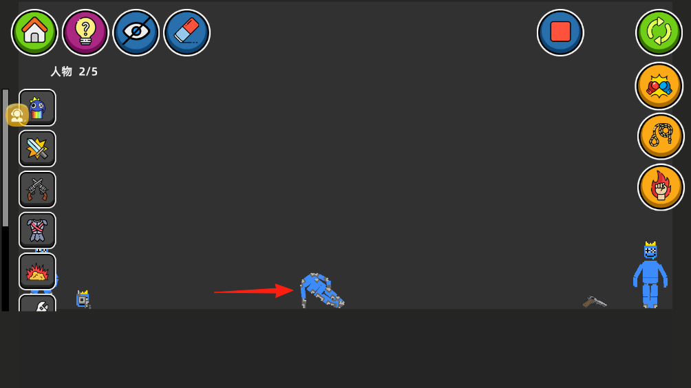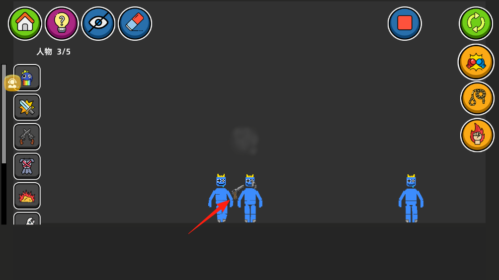 2、操控蓝色火柴人,按箭头指引,靠近敌人持武器角色,点击右侧技能,发动攻击,注意人物存活数,及时调整战术。