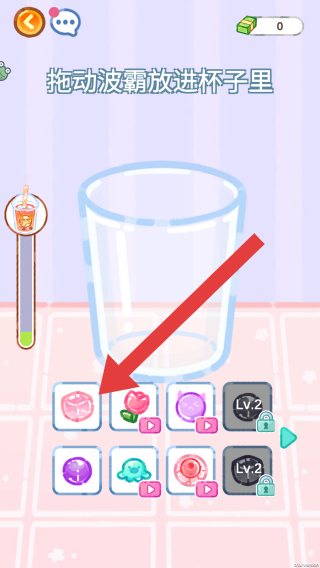 2、任务是拖动波霸放进杯子里,画面有杯子、不同波霸材料含锁定和可使用的,属于材料制作、互动操作的场景,核心是按步骤制作饮品,完成经营任务。
