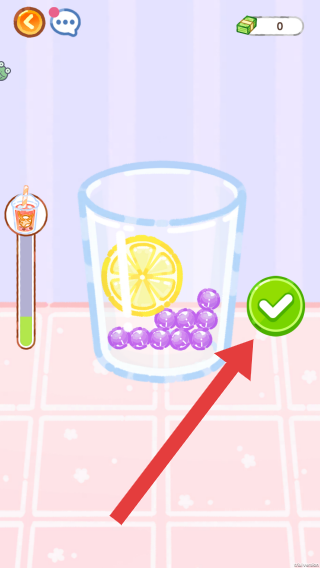 3、任务是完成饮品制作杯中已放柠檬、紫色波霸,点击绿色对勾✔按钮可提交完成制作,属于模拟经营中制作饮品的互动场景。