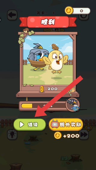 3、显示胜利,可获得200金币,点击继续进入下一关,属于闯关成功后的结算场景,核心是保护小鸟躲避老鹰完成关卡。