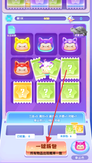 3、点击一键拆包按钮,完成游戏任务,获取游戏得分和奖励,积累游戏资源,提升角色的能力。