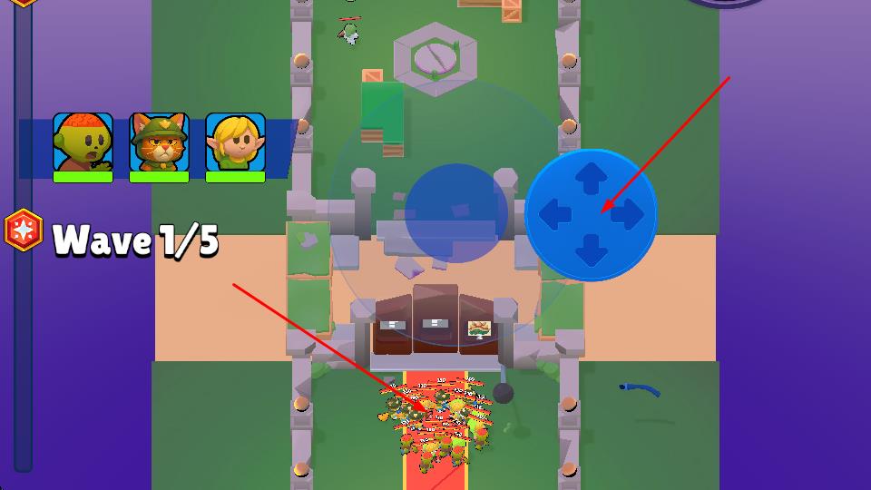 3、进入战斗界面,左侧角色栏、上方Wave1/5波次标识清晰呈现,操控右侧方向键指挥已选角色移动,动态调整站位、释放技能,持续抵御攻势。