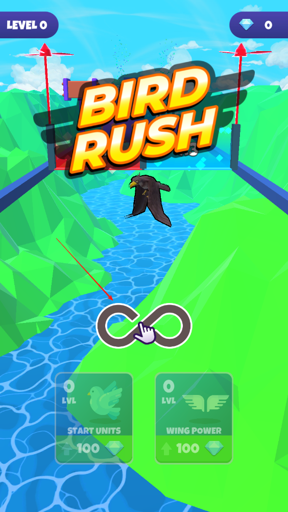 1、在初始界面可以利用赚到的钻石升级鸽子的能力,让乌鸦体型变得更大,翅膀的力量更强,点击屏幕即可让鸽子开始向前飞行。