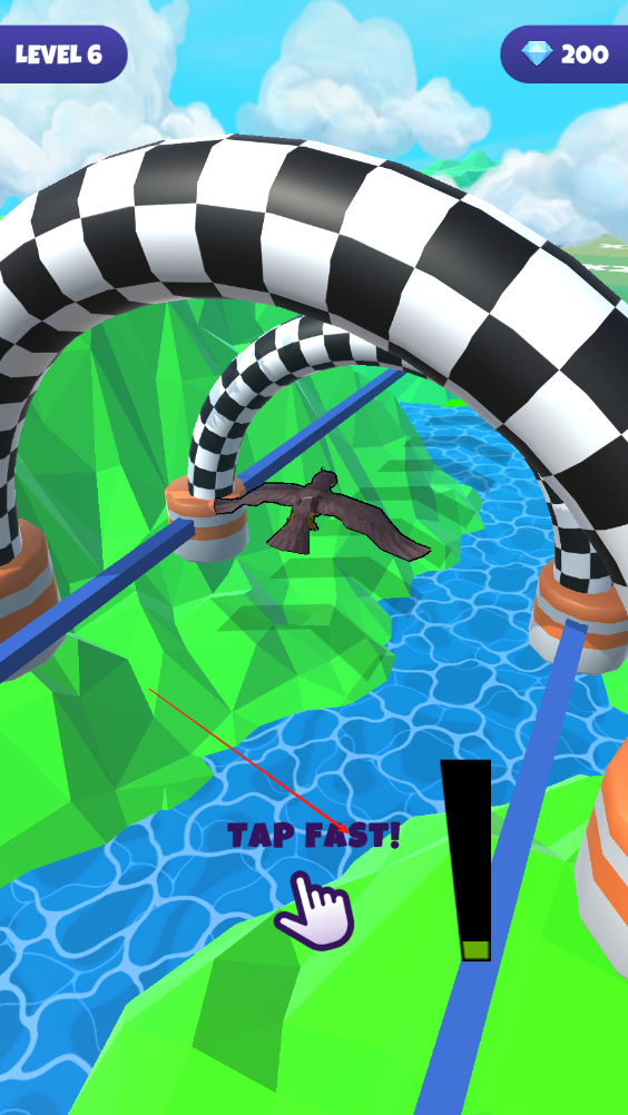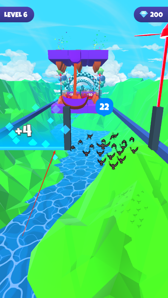2、滑动屏幕让鸽子穿过能让鸽子数量变多的屏障,注意避开障碍以及能让鸽子变少的屏障,冲进终点。