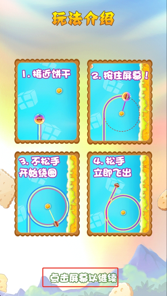 1、进入玩法介绍,按步骤了解,先让角色接近饼干,接着按住屏幕,不松手让角色绕圈积蓄力量,最后松手让角色飞出吃饼干。