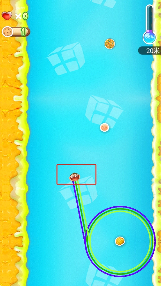 2、操控角色靠近饼干,长按屏幕使角色绕圈,利用绕圈惯性,在合适时机松手,让角色沿轨迹飞出,收集路径上的饼干。