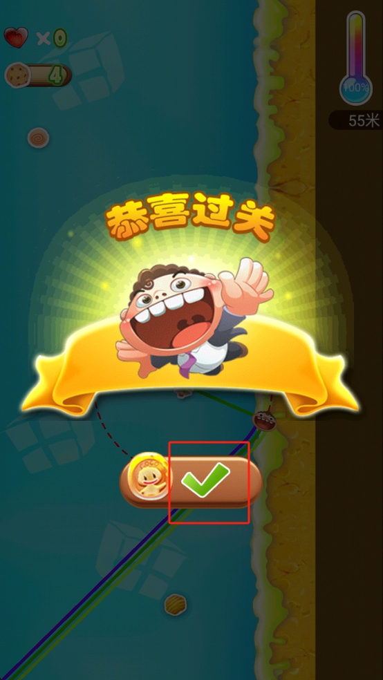 3、成功吃到足够饼干后,触发恭喜过关,点击绿色对勾按钮,进入下一关,继续挑战更复杂的绕圈吃饼干关卡。