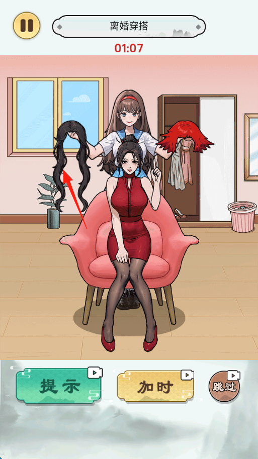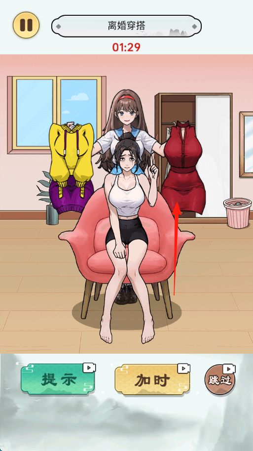 1、进入房间场景,先点击右侧红色连衣裙,将其为坐着的主角穿上,完成基础着装改变。