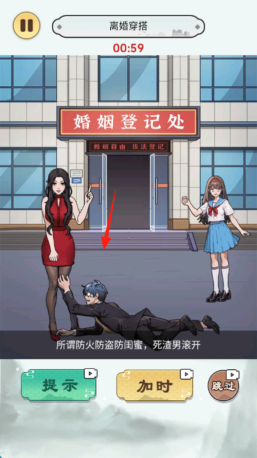 3、场景切换到婚姻登记处,点击地上纠缠的男性角色,触发所谓防火防盗防闺蜜,死渣男滚开剧情,完成关卡挑战。