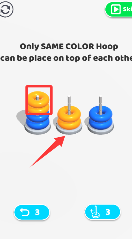 1、基础操作规则,通过拖拽将圆环在立柱间移动,最终实现所有圆环按颜色分类并有序排列的目标状态。