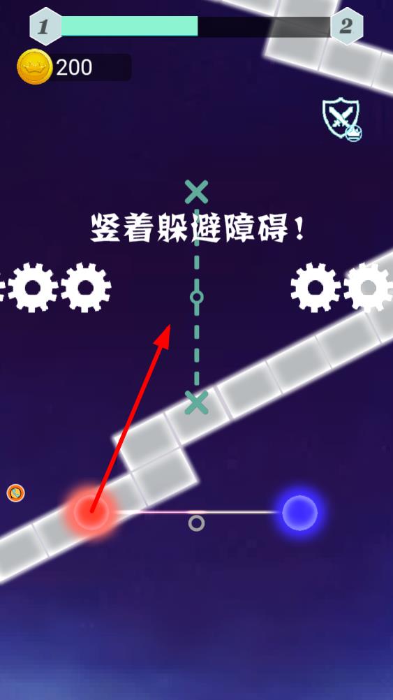 2、你要操控小球沿着绿色虚线所示的垂直方向移动,小心两侧的齿轮,精准避开它们,这样才能顺利通过这一阶段。
