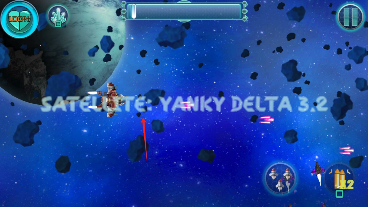 3、游戏中操控飞船,在太空中射击敌人,躲避陨石,关注卫星信息,合理利用道具,完成关卡任务。