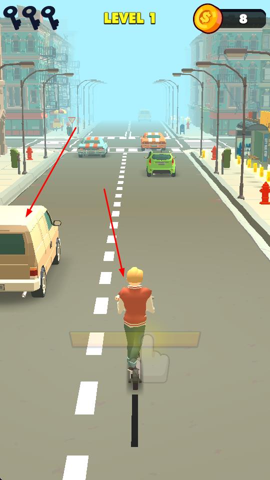 2、在街道行驶中,操控角色左右移动滑板车,躲避前方及两侧出现的汽车,借助灵活变向,在车流间隙中穿行,保障滑板车持续前行。