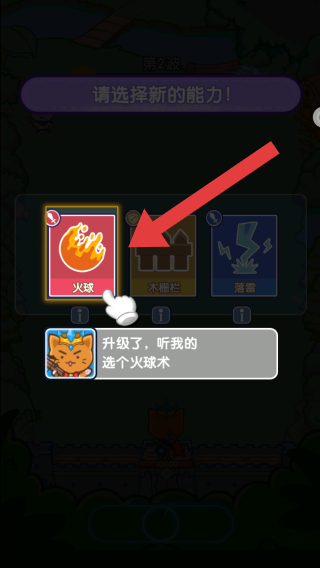 2、处于第2波阶段,需选择新能力,可选择火球、木栅栏、落雷,小猫建议选火球术,用于防御敌人进攻。