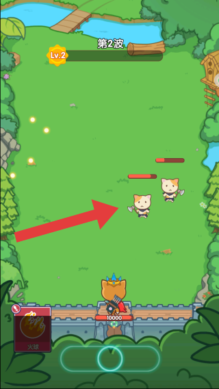 3、目前是第2波的敌人发起进攻,技能火球处于冷却状态,玩法为操控戴皇冠小猫,用技能抵御小猫造型敌人入侵,守护城堡。