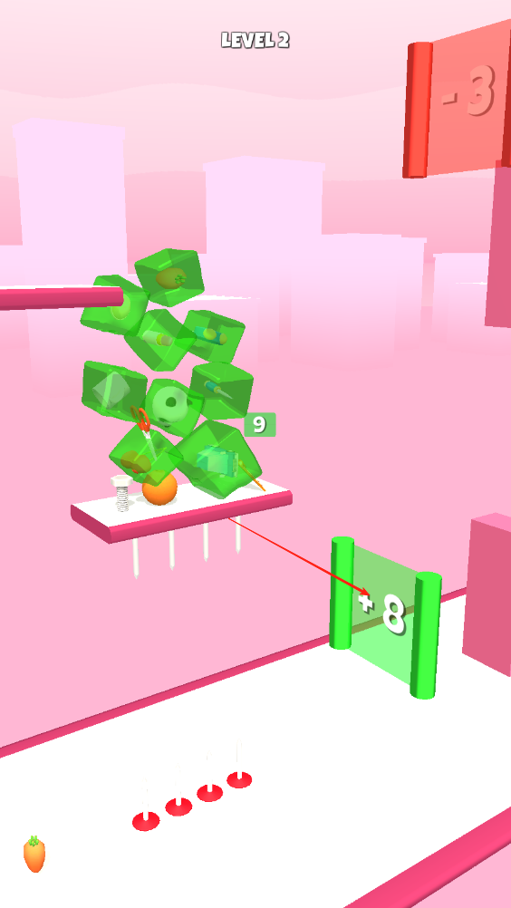 1、点击屏幕可以控制果冻跳跃,控制果冻穿过+或x屏障,让果冻的数量增加,注意躲避障碍。