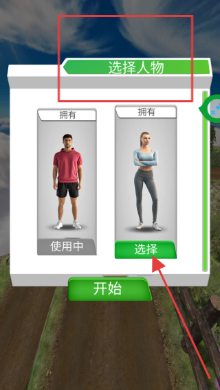 1、在选择人物界面中,选择右侧的女性角色,点击选择按钮,完成角色的选择,开始进行游戏任务。