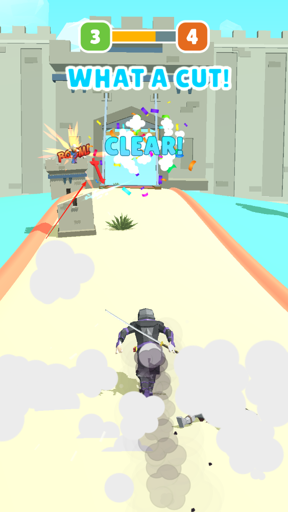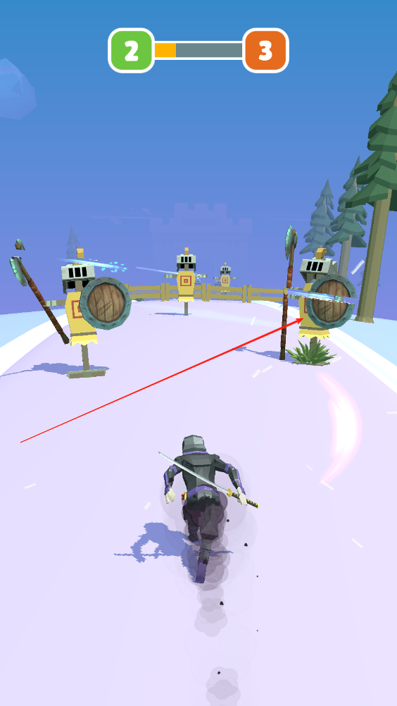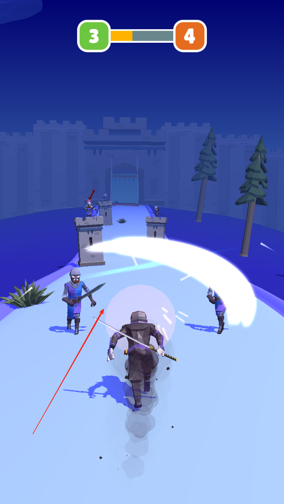 2、向前奔跑,应对前方出现向我们跑来的敌人,滑动屏幕将其消灭,斩杀迎面而来的敌人。