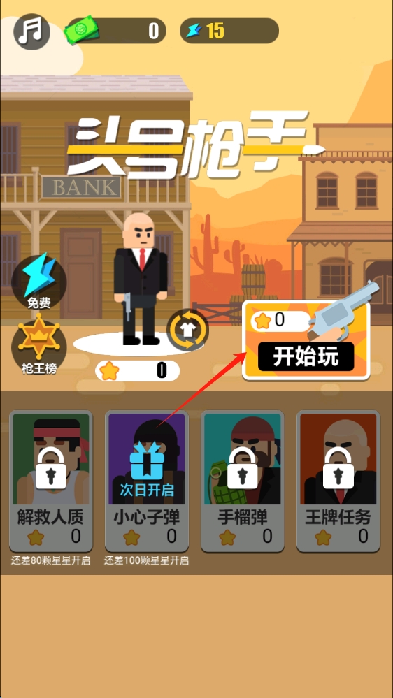 1、启动游戏后,点击开始玩,进入头号枪手,开启刺激的射击冒险之旅,点击开始游戏。