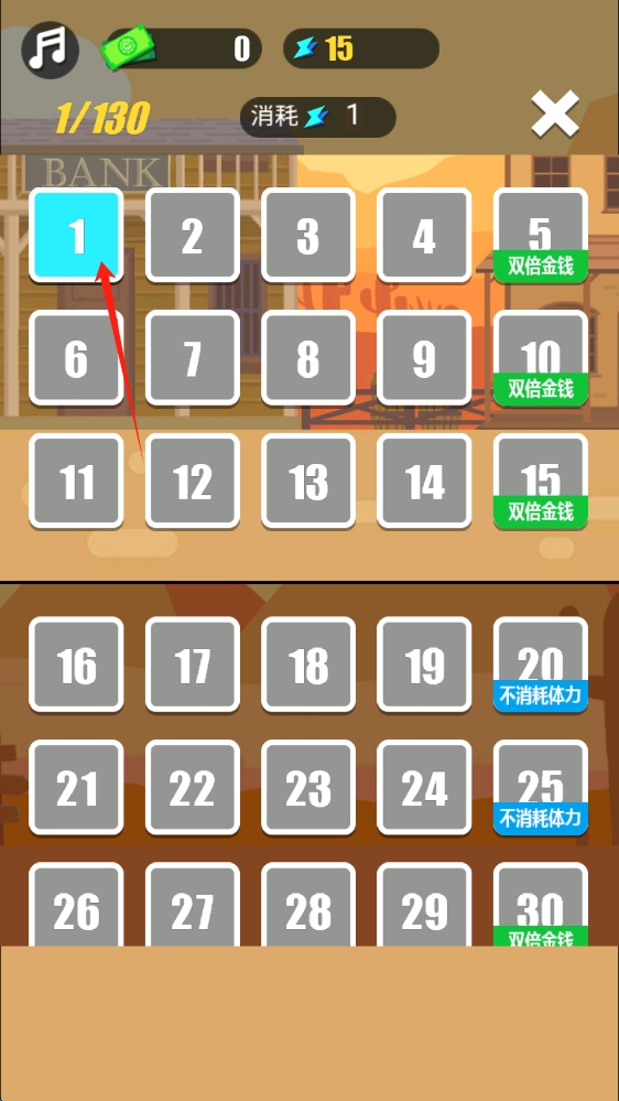 2、在关卡选择界面,点击数字1关卡,开始第一关,熟悉射击操作,积累经验,点击选择关卡。