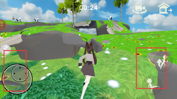 2、利用红色方框内的虚拟按钮控制角色的移动和跳跃,躲避怪物的追逐,完成游戏任务,获取游戏得分和奖励。