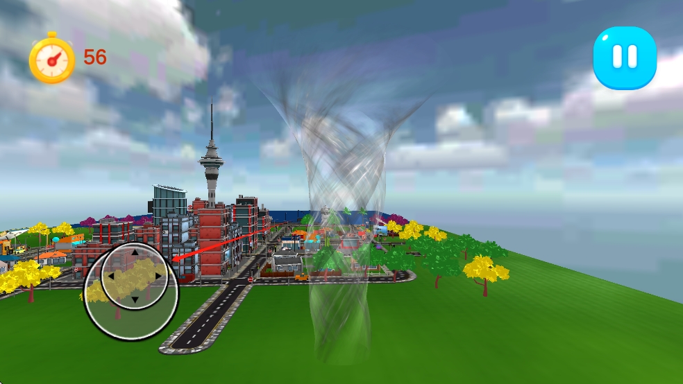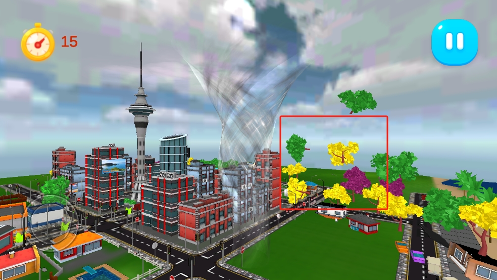1、开局有倒计时,左侧摇杆控制视角或移动,关注龙卷风,规划路线,卷走树木,破坏城市的建筑。
