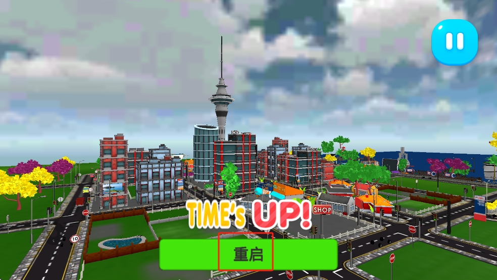 3、完成当前城市的破坏模拟后,会显示时间到了,点击绿色的重启按钮,可以重新开始本关。