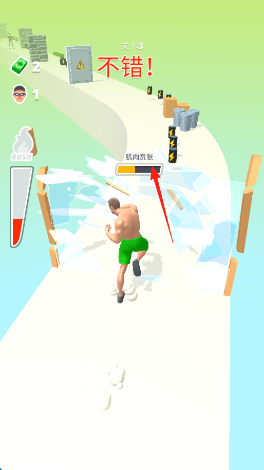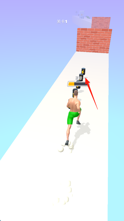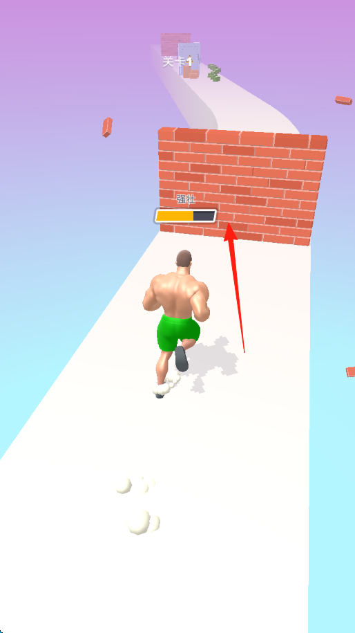 1、操控肌肉男,沿跑道冲刺,遇到砖墙显示强壮进度条,保持冲刺,撞碎障碍,收集路上道具。