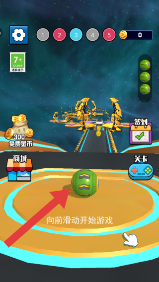 1、有向前滑动开始游戏提示,呈现太空或科幻风格赛道场景,属于开始前的准备页面,引导玩家启动滚球跑酷玩法。