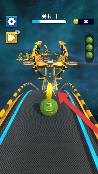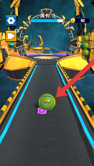 3、玩家操控绿色滚球在科幻风格赛道前进,遇到障碍物挡在前方时,可以通过球的速度进行撞击,属于滚球跑酷的闯关环节。