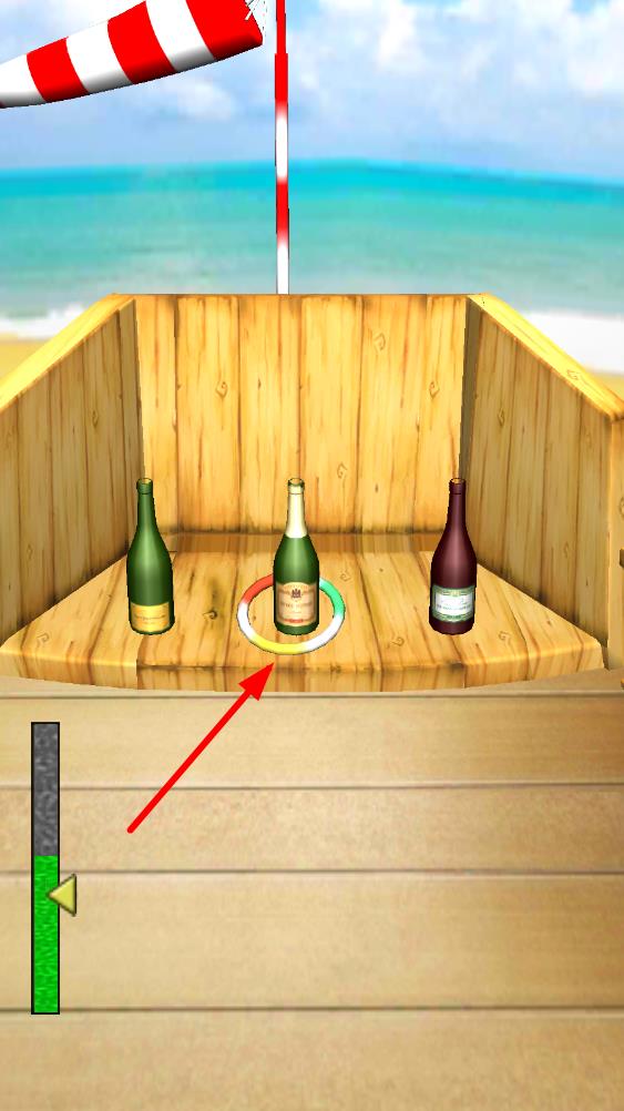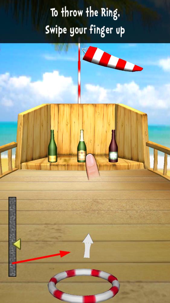 2、观察屏幕中的瓶子位置和风力提示,点击屏幕向前滑动控制圈圈发射的力度和方向,尝试套中目标。