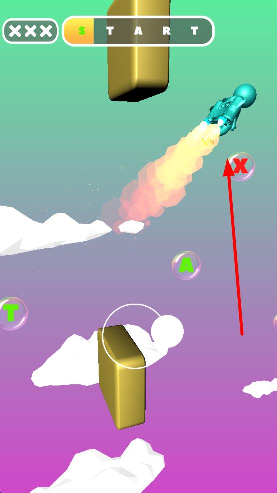 3、继续飞行,留意箭头指向的字母气泡,优先撞击有益字母,避开X等不利气泡,同时注意躲避金色方块障碍,保持飞行安全。