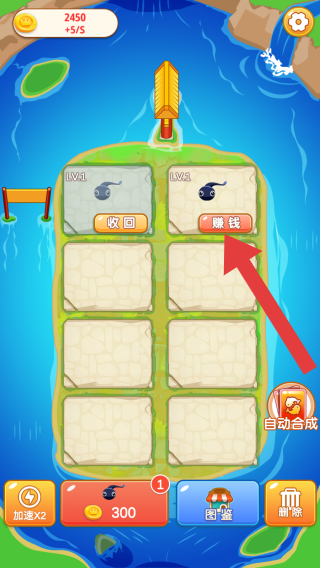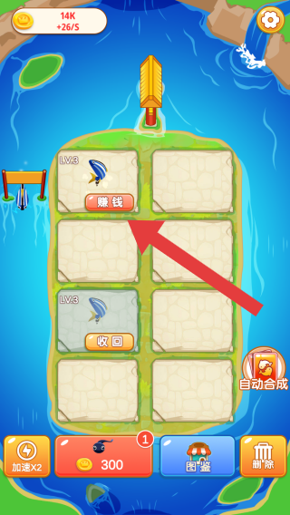 3、呈现岛屿地图布局,有LV.8的物品格子,将它们进行合并,合并升级到最高级时可以点击赚钱去赚取金币。