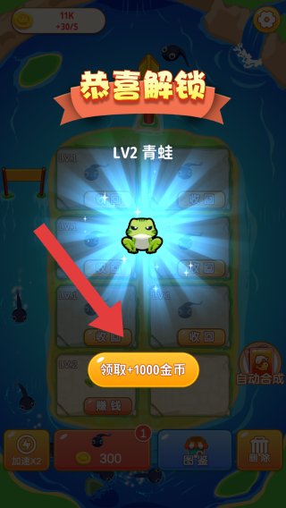 2、可将两个小蝌蚪移动进行合并,解锁新的图鉴,解锁后可领取1000金币,属于合成升级后获得新物品及奖励的环节。