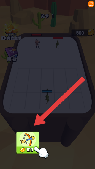 1、场景为沙漠风格,根据提示点击下方绿色按钮是花费100金币购买弓箭类防御单位的操作,属于部署防御塔抵御敌人的环节。