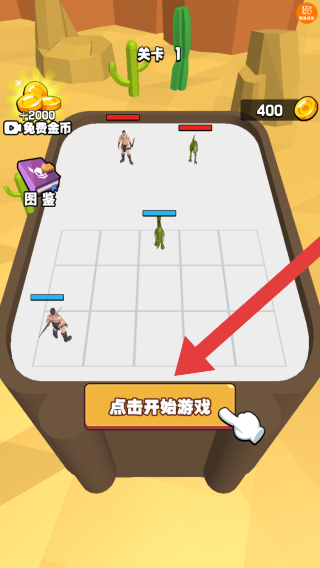 2、画面中有火柴人角色、敌人,显示了金币数量、免费金币获取提示+2000以及图鉴按钮,下方点击开始游戏按钮用于启动关卡战斗。