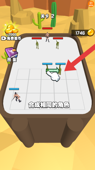 3、目前处于关卡2,提示合成相同的角色,属于通过合成提升战力,应对敌人上方火柴人及绿色怪物的闯关环节。