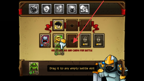 2、根据红色箭头所指的方向,将角色拖动到空的战斗槽中,完成游戏任务,获取游戏得分和奖励。