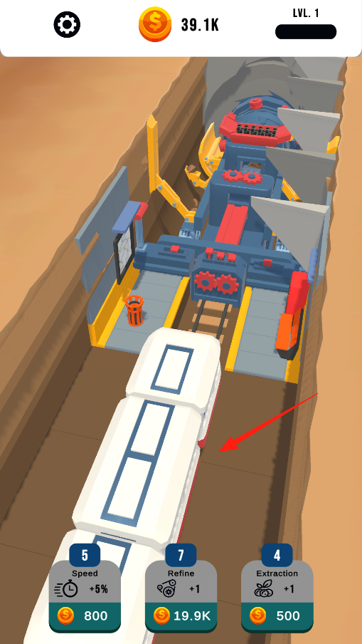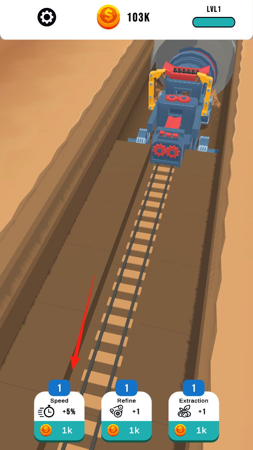 1、进入隧道挖掘机,点击Speed,Refine,Extraction按钮,消耗金币升级对应属性,提升速度精炼或开采能力,让采矿车高效挖掘,体验属性养成机制。