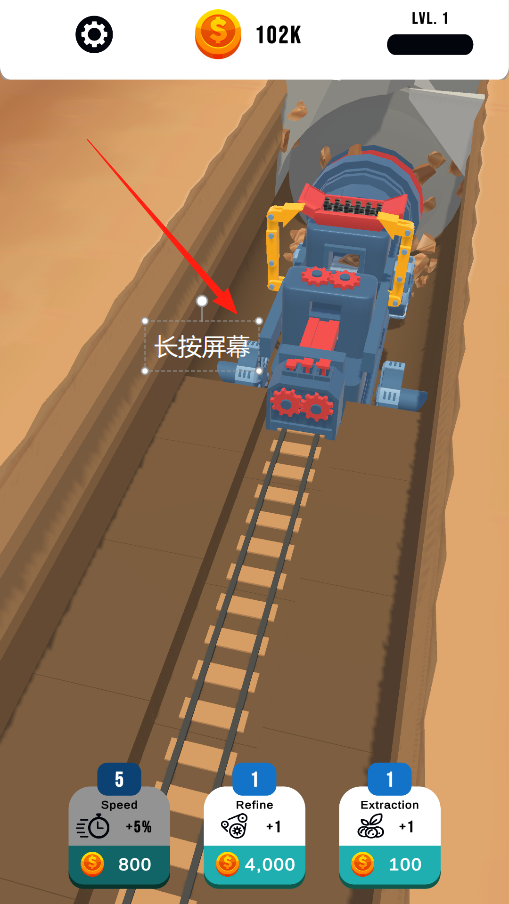 2、长按屏幕控制采矿车挖掘,持续按压采矿车向前掘进,收集资源松开则停止,通过长按操作把控挖掘节奏,体验交互挖掘玩法。