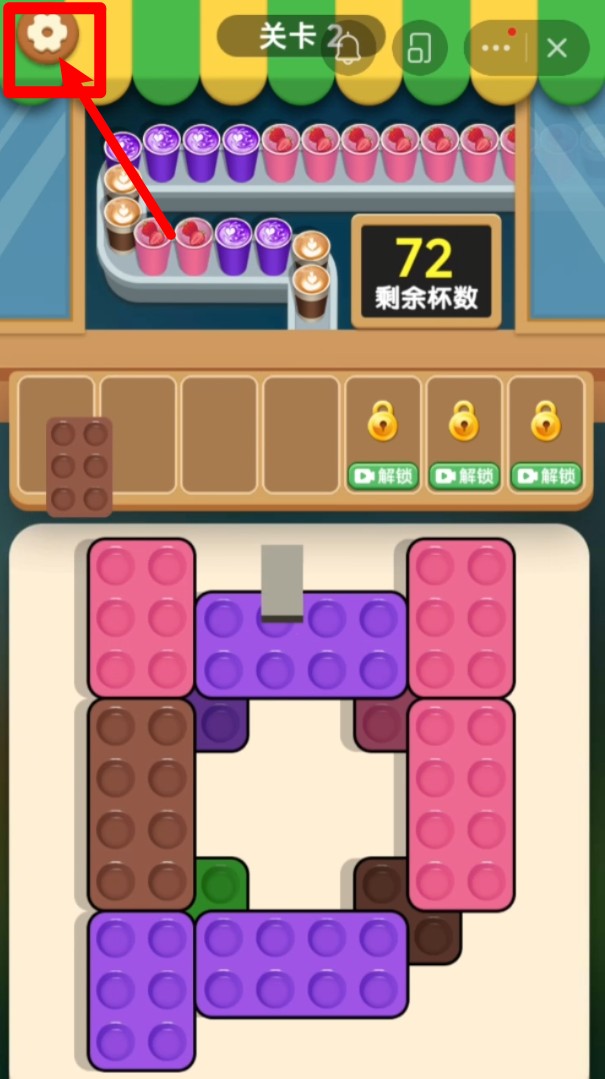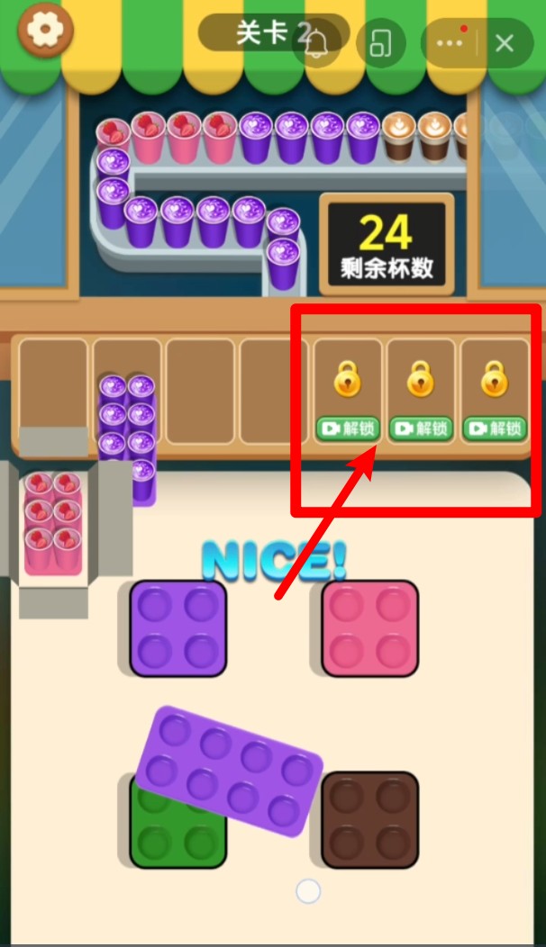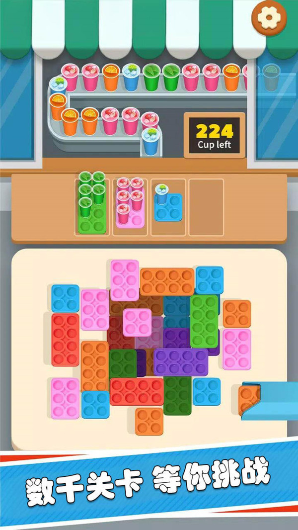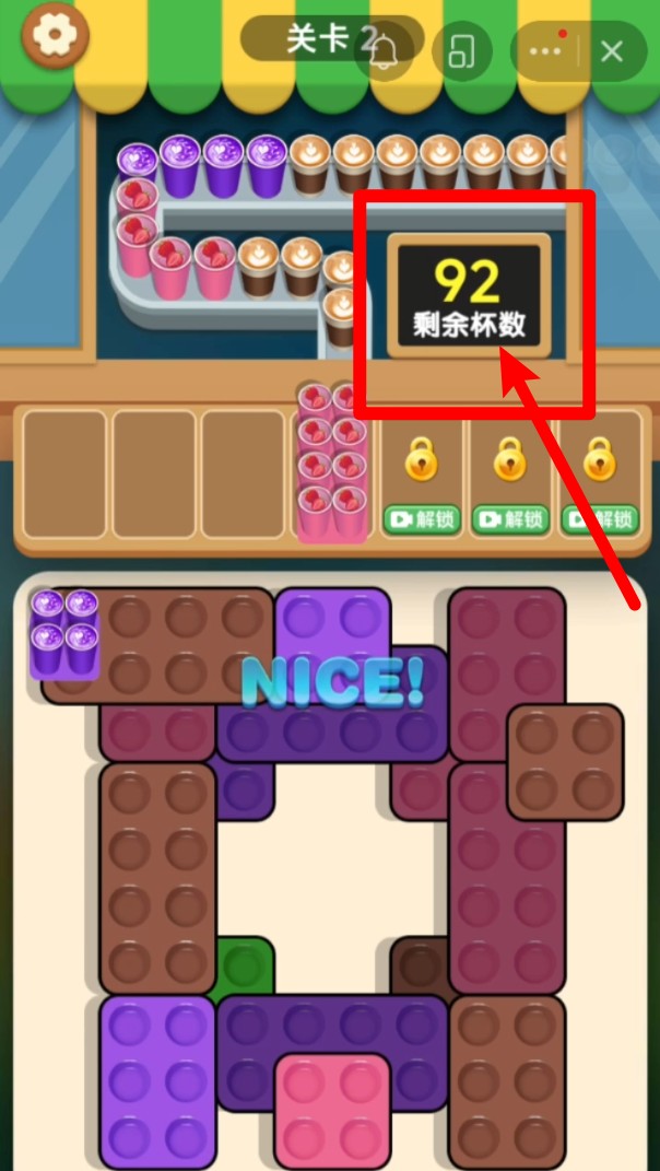1.剩余杯数倒数提醒玩家把握节奏,通过合理放置不同颜色咖啡杯,快速完成消除目标。