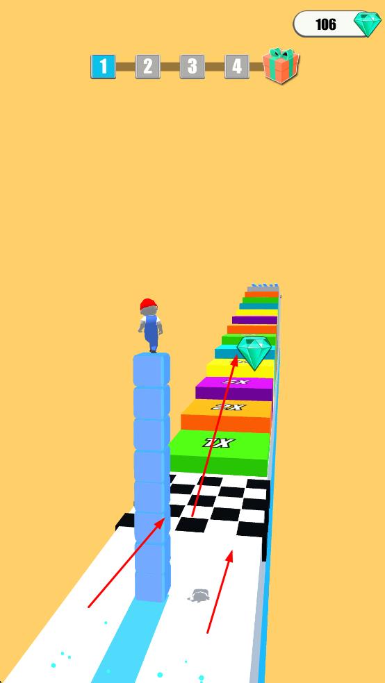 3、留意上方显示的关卡进度、钻石数量等信息,努力收集更多蓝色方块,堆叠更高的柱子,最终到达赛道终点。