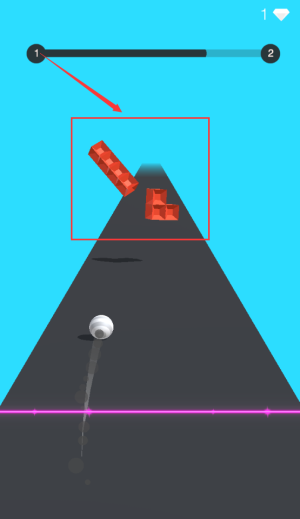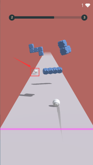 2、避开红框内橙红方块,让白球安全滚落斜坡。