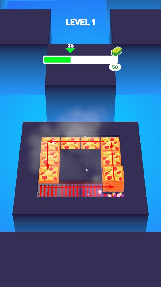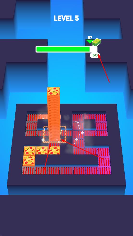 2、通过特定操作控制角色的移动方向,避开红色的障碍物,收集更多的披萨方块。