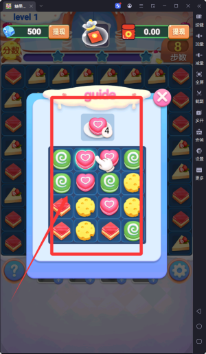1、玩家需要通过滑动屏幕移动糖果,使三个及以上同色图案横竖相连即可完成消除,达成指定目标即可过关。